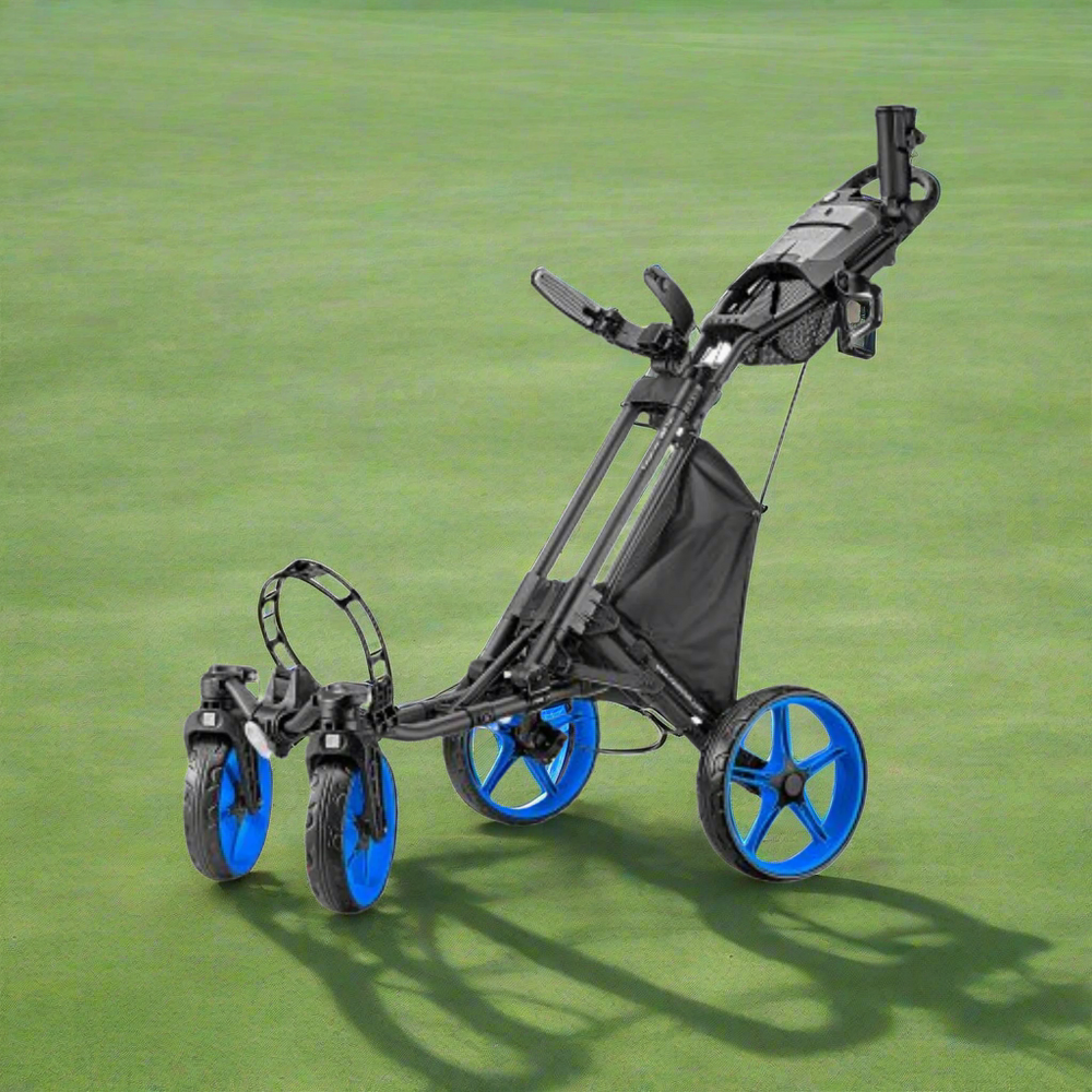 The CaddyTek CaddyCruiser ONE Tour 4 Wheel unique one-click folding 4-wheel golf cart mastered by CaddyTek now comes with not only the easy-to-use hand brake, but also with Swivel Front Wheel with a locking mechanism. Golfers can switch between swivel or straight mode by toggling the lever on the handle and move on or off the golf course with ease and swiftly. Rain or shine, cart your clubs around the green in style. Enjoy the game with CaddyTek!