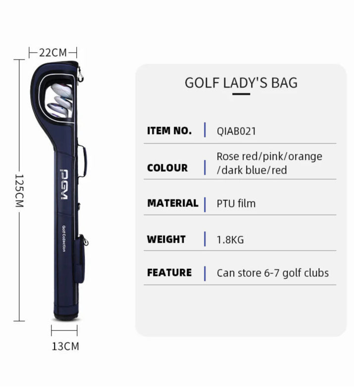 The PGM QIAB021 is a premium Sunday golf bag designed for minimalist golfers who value portability, style, and smart storage. Weighing just 1.8 kg, this ultra-light bag is perfect for off-course practice, quick rounds, or travel. Crafted from durable PTU film, it features a reinforced bottom, smooth zipper system, and embroidered brand logo for a refined finish. With space for 6–7 clubs, it’s a sleek companion for casual or competitive play.