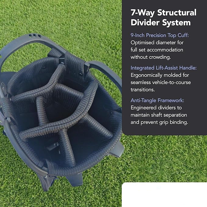 - 7-Way Divider Top: 9-inch top cuff with a structured 7-way divider system keeps golf clubs organised and separated for quick selection while helping prevent grip tangling during play.
