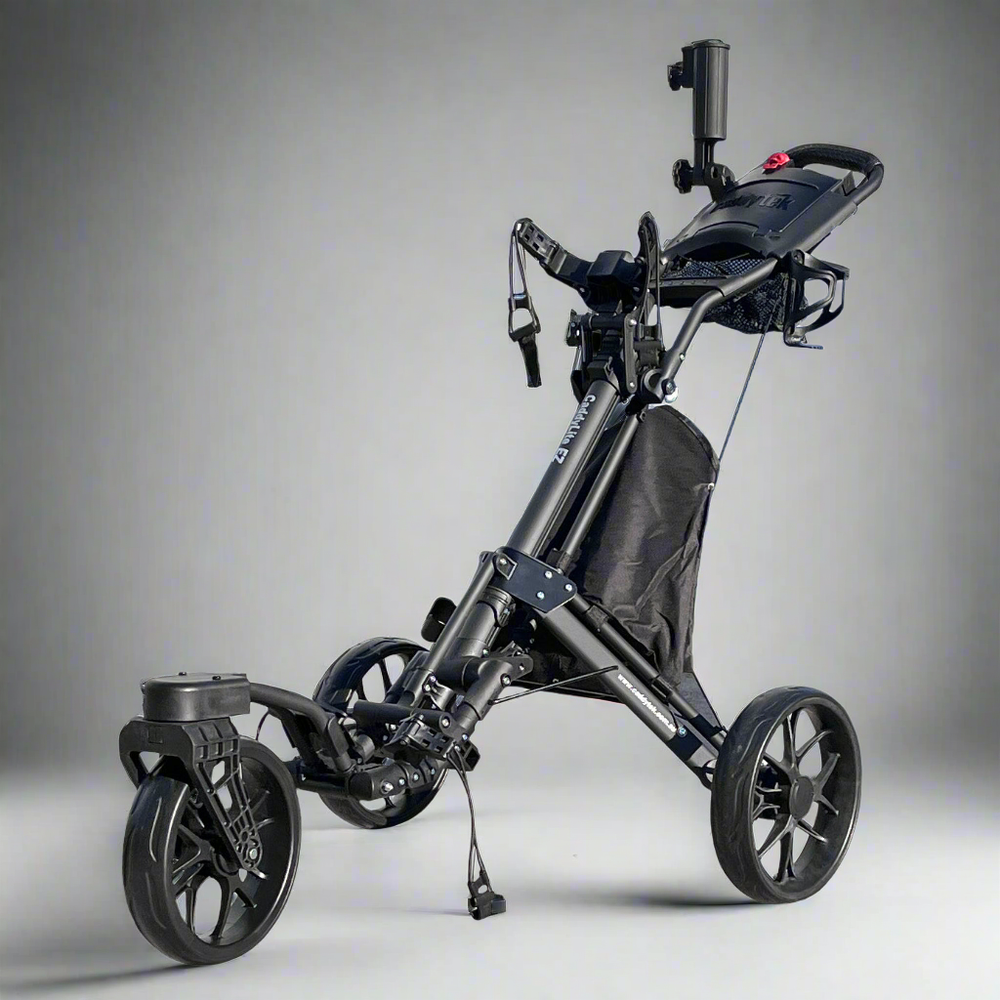 Experience maximum convenience and maneuverability with the CaddyTek EZ-Fold Push Cart, now upgraded with a 360° swivel front wheel that locks in place for straight tracking when needed. Its one-click folding mechanism collapses the cart in one smooth step, making transport and storage effortless. Built with a strong aluminum frame, maintenance-free EVA wheels, and smart storage compartments, this cart delivers premium performance for golfers who prioritize both function and speed.