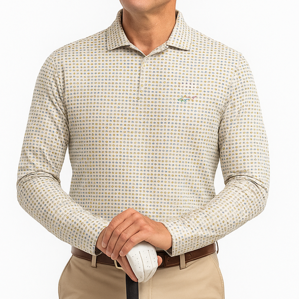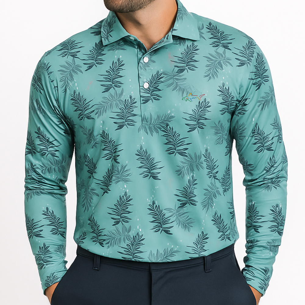 The Greg Norman Men's Desert Palm Printed Long Sleeve Golf Polo - Light Green blends tropical flair with athletic performance. While I didn’t find this exact style listed by name, similar polos from Greg Norman feature: