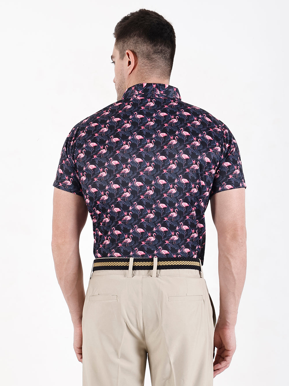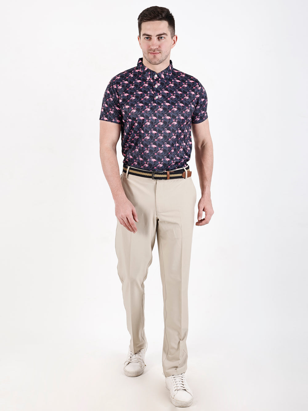 Introducing a one-of-a-kind men's golf polo that seamlessly blends style and functionality. Stand out on the green with its captivating design boasting a playful array of pink flamingos set against a sleek dark backdrop. Crafted with a classic collar and a three-button placket, this short-sleeved shirt exudes timeless elegance. Its tailored fit guarantees both comfort and freedom of movement, catering to both sporting endeavors and casual outings alike. Designed from lightweight, extremely stretchable fabric, it's designed to move with you, ensuring maximum comfort and flexibility as you play.