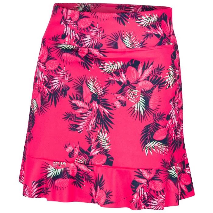The Greg Norman Women's Corina Pull-On Flounce Golf Skort showcases a tropical leaf print for a standout look on or off the course. This skort features lightweight, breathable, moisture-wicking fabric and is finished with a compression knit short liner for added comfort and coverage.