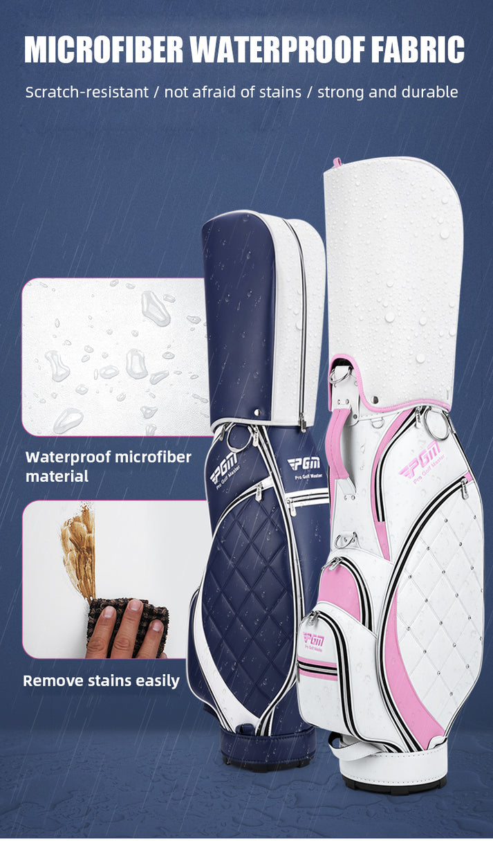 Designed for elegance and performance, the PGM QB103 Golf Tour Staff Bag blends premium materials with functional design tailored for women golfers. Crafted from waterproof microfiber and TPU, this lightweight cart bag features a reinforced base, thickened club dividers, and diamond-style accents that elevate its visual appeal. With ample storage and a soft, high-elastic shoulder strap, it’s built for comfort, durability, and style on every round.