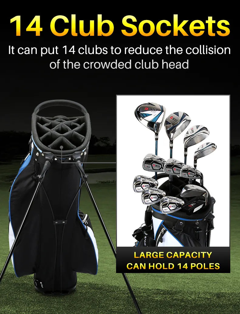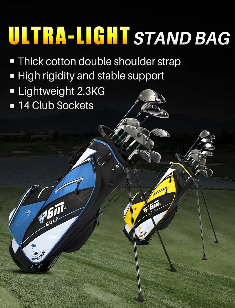 The PGM QB027 is a premium golf stand bag designed for lightweight portability and full club organization. Featuring a 14-way divider system, it accommodates a complete set of clubs while minimizing head collisions. The double shoulder strap and stable stand base make it ideal for walking rounds, while the multi-pocket layout ensures you have space for all your gear. Crafted from waterproof, wrinkle-resistant nylon, this bag blends durability with sleek design.