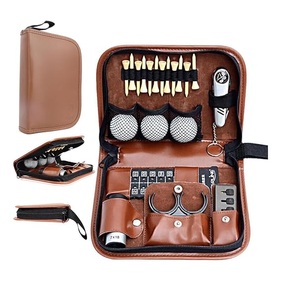 - The golf accessory come in a high-grade handbag (9 x 6.6 x 2 inches) which is portable and includes Golf Balls, Rangefinder, Cleaning Brush, Golf Tees, Multifunctional Divot Tool, Golf Clip Ball Holder, Scorer.