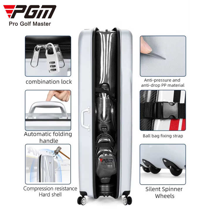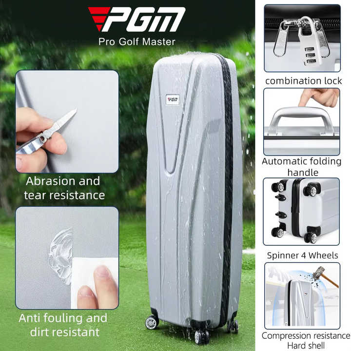 The PGM HKB015 is a premium-grade golf travel bag designed for air travel and long-distance transport. Crafted from high-strength waterproof PP shell with sponge lining, it offers exceptional impact resistance, capable of bearing up to 100kg. Its large internal capacity accommodates full-size golf bags, while the silent universal four-wheel system ensures smooth mobility. Ideal for professional golfers and frequent travelers, this case combines durability, security, and sleek design.